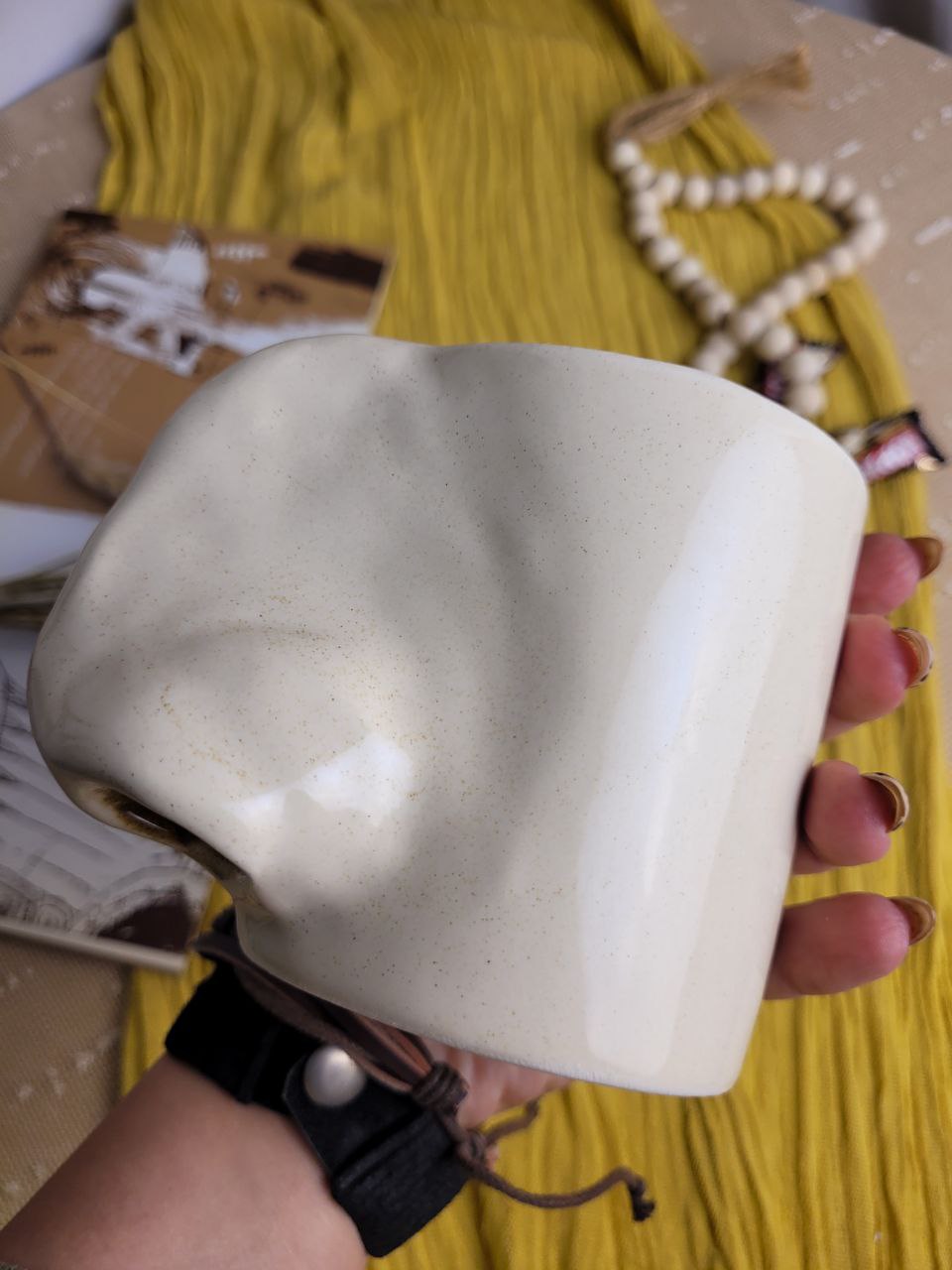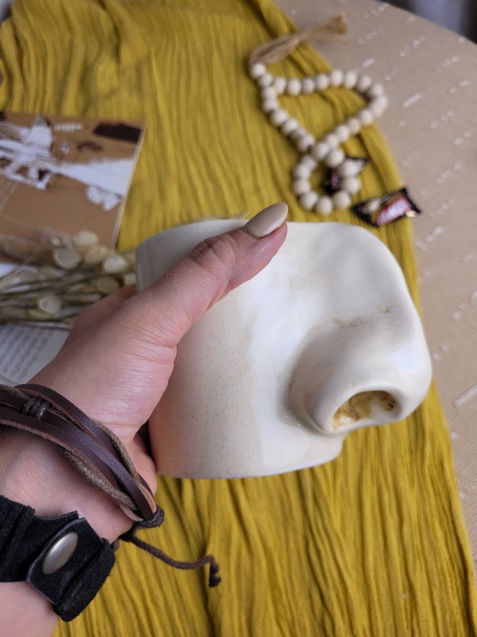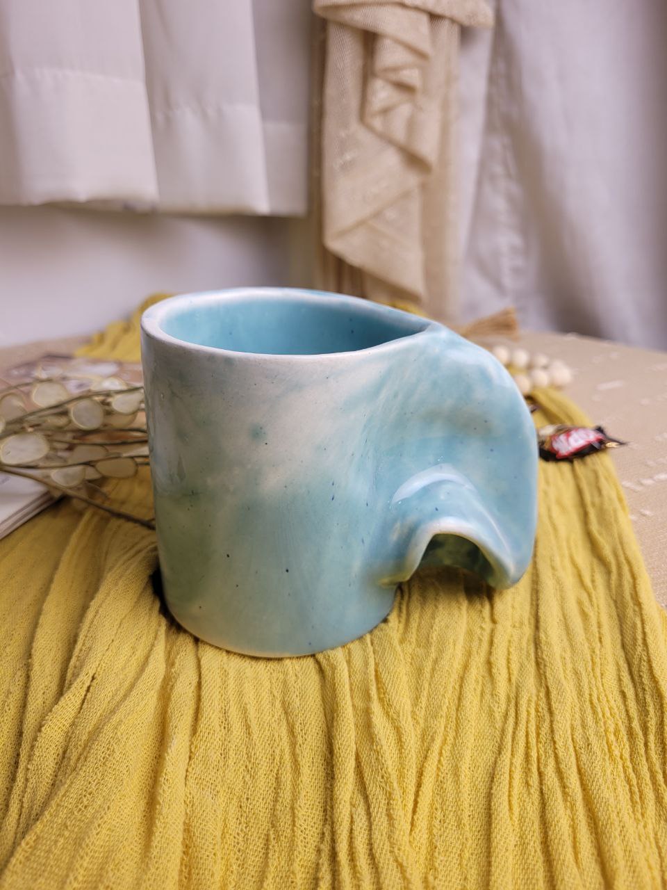 لیوان سرامیکی با چهره کاریکاتوری و دماغ برجسته، بی دسته و با رنگ‌های آبی آرام. ترکیبی از کاربری نوشیدنی و اثر هنری که به میز نوشیدنی یا قفسه‌های دکور جان می‌بخشد و فضای خانه را با طراوت و شوخ‌طبعی می‌آراید.
