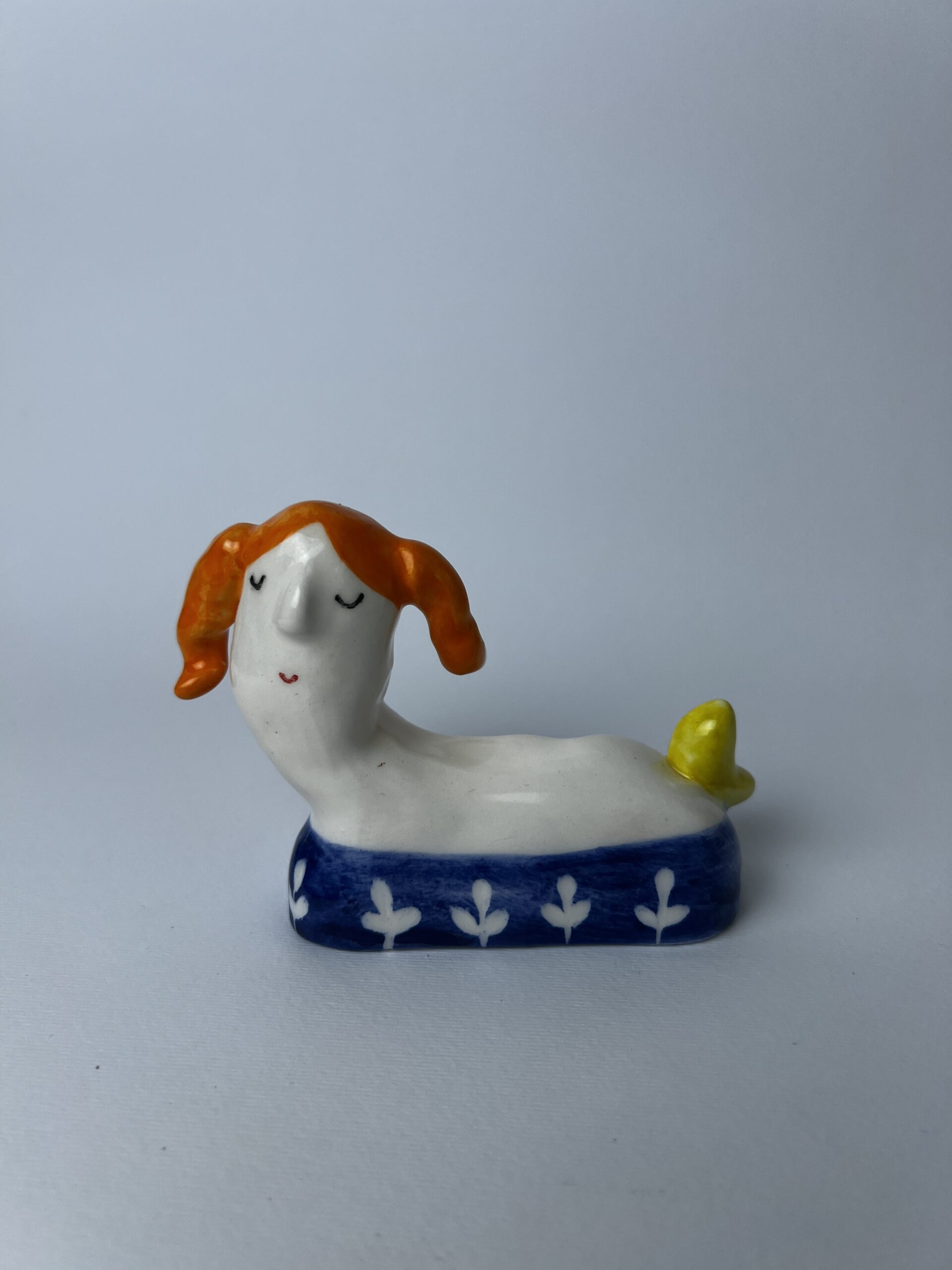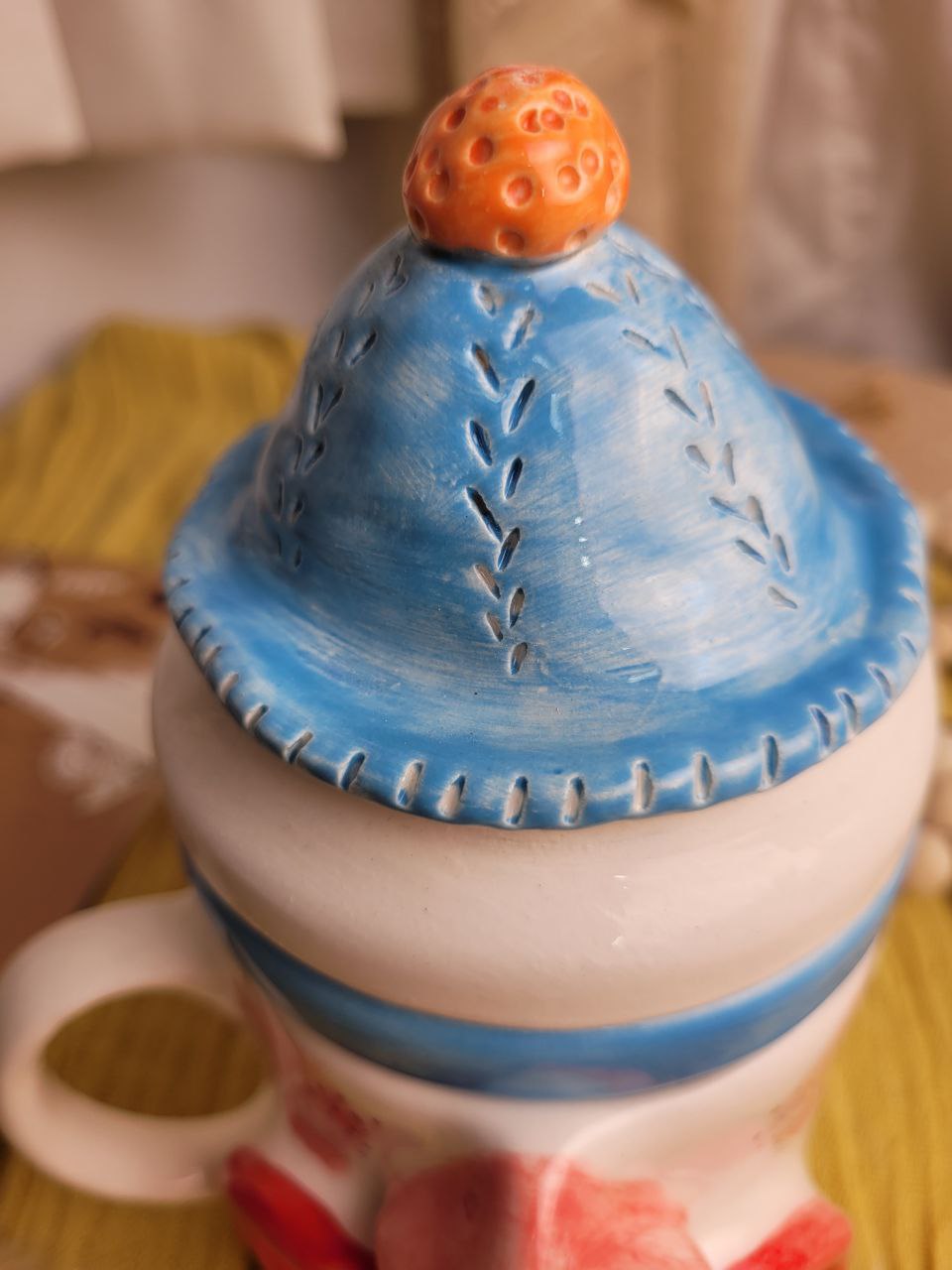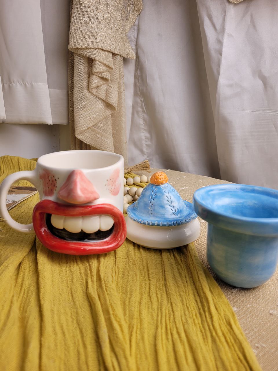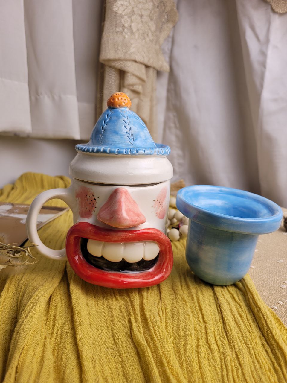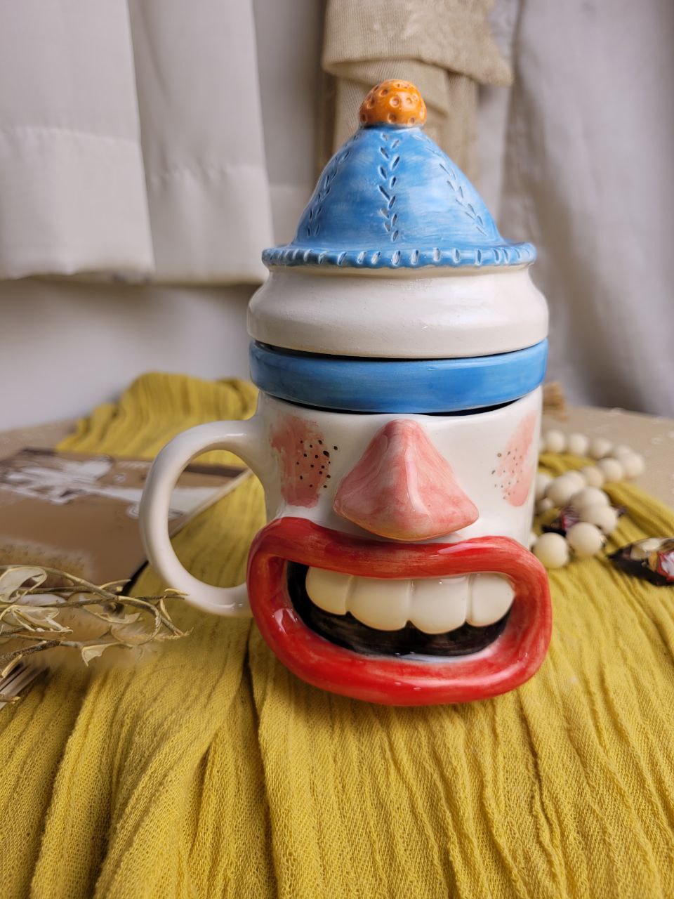 ماگ با طراحی جذاب به شکل کاریکاتور صورت وجود دارد که حس شوخطبعی و خنده را منتقل میکند. چهره دارای چشمهای درشت، بینی مشخص و لبهای بزرگ با دندانهای نمایشدادهشده است. در پسزمینه، ترکیبی از رنگهای گرم و سرد بهطور هنری بهکار رفته تا حس تازگی و سرمایی بودن این لیوان دمنوش را تقویت کند.